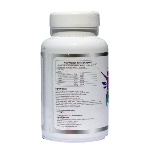 इसमें गार्सिनिया मैंगोस्टाना (मैंगोस्टीन एक्सट्रेक्ट) – 56mg, इल्युथेरोकोकस सेंटिकोसस (साइबेरियन जिनसेंग एक्सट्रेक्ट) – 26mg, क्लोरोफाइटम बोरीविलियनम (सफेद मूसली एक्सट्रेक्ट) – 18mg, संबुकस निग्रा (एल्डरबेरी एक्सट्रेक्ट) – 27mg, वैक्सीनियम मर्टिलस (बिलबेरी एक्सट्रेक्ट) – 31mg, विदानिया सोम्निफेरा (अश्वगंधा एक्सट्रेक्ट) – 41mg, गिंको बिलोबा एक्सट्रेक्ट – 24mg, रूबिया कॉर्डिफोलिया (मंजीष्ठा एक्सट्रेक्ट) – 29mg, मोरिंगा ओलीफेरा (सहजन/सिंगरु एक्सट्रेक्ट) – 24mg, एस्परैगस रेसमोसस (शतावरी एक्सट्रेक्ट) – 21mg, बोएरहाविया डिफ्यूसा (पुनर्नवा एक्सट्रेक्ट) – 27mg, ट्राइबुलस टेरेस्ट्रिस (गोक्षुरा एक्सट्रेक्ट) – 26mg, और नैनो करक्यूमिन (अंतरराष्ट्रीय गुणवत्ता) – 50mg